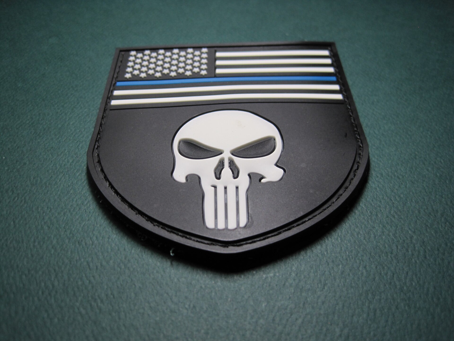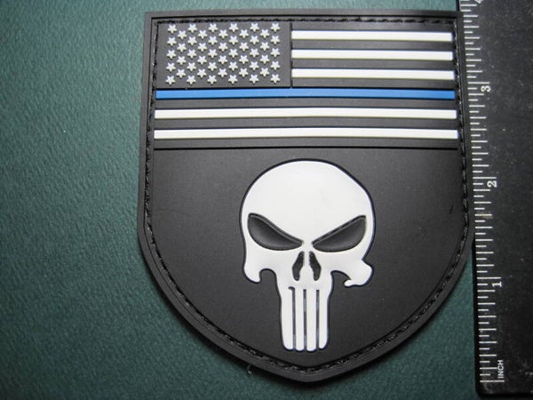 U.S. FLAG CREST PATCH BLUE LINE PUNISHER SKULL PVC RUBBER HOOK BACK